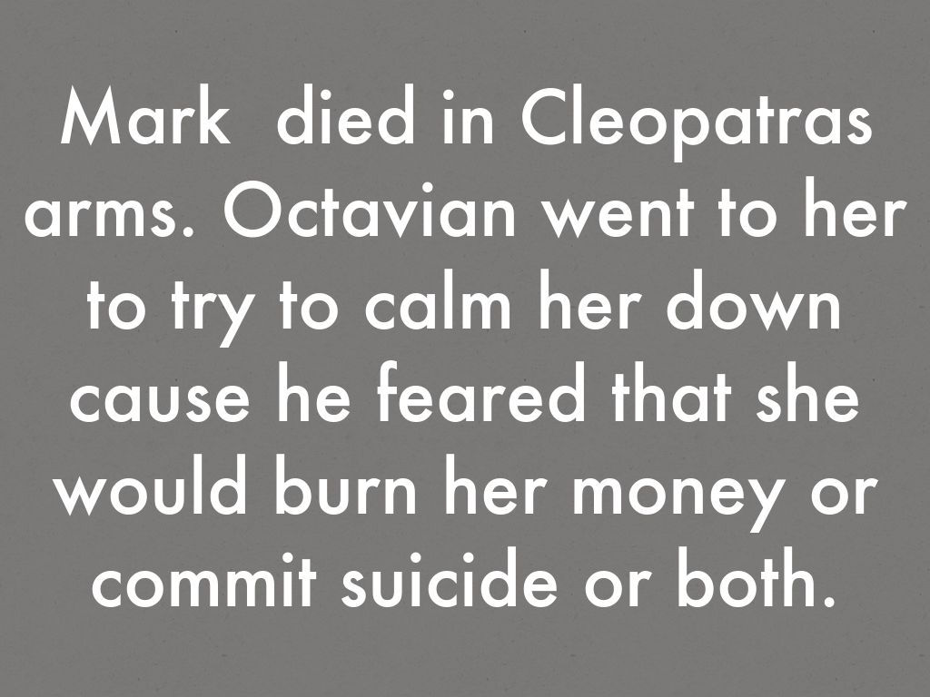 Mark died in Cleopatras arms. Octavian went to her to try to calm her down cause he feared that she would burn her money or commit suicide or both.