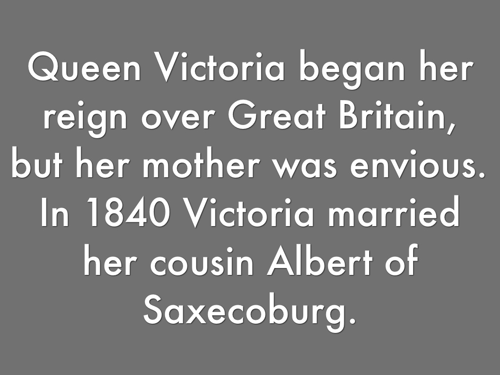 Queen Victoria began her reign over Great Britain, but her mother was envious. In 1840 Victoria married her cousin Albert of Saxecoburg.
