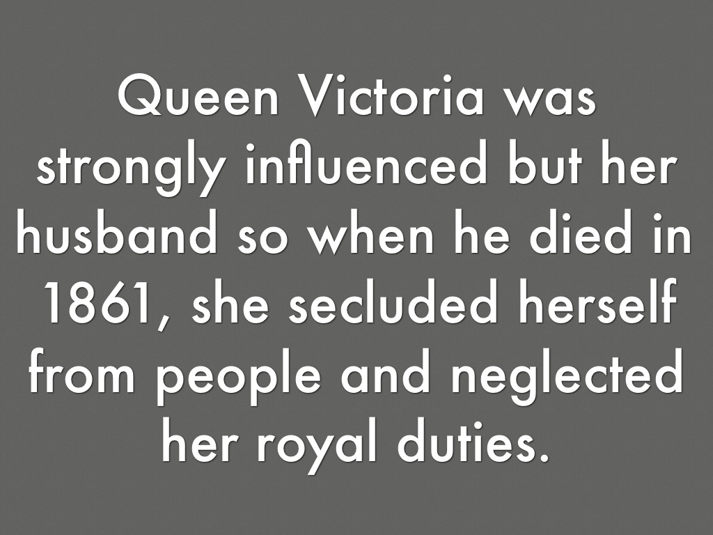 Queen Victoria was strongly influenced but her husband so when he died in 1861, she secluded herself from people and neglected her royal duties.