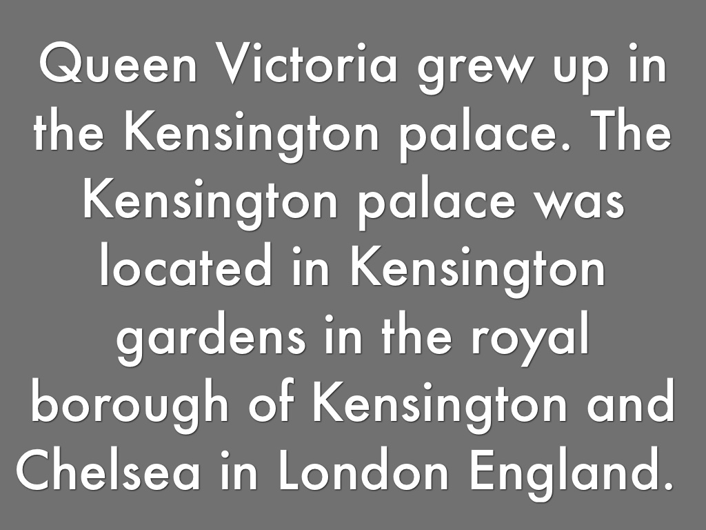 Queen Victoria grew up in the Kensington palace. The Kensington palace was located in Kensington gardens in the royal borough of Kensington and Chelsea in London England.
