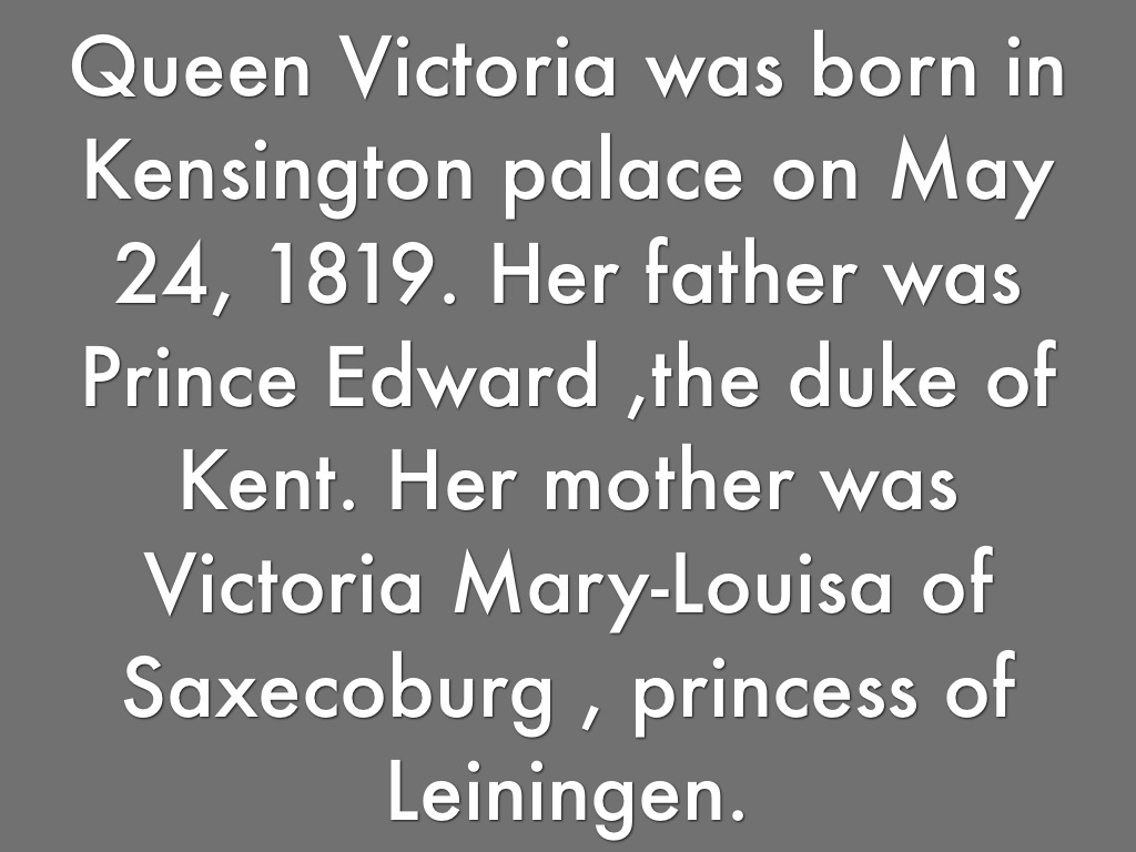 Queen Victoria was born in Kensington palace on May 24, 1819. Her father was Prince Edward ,the duke of Kent. Her mother was Victoria Mary-Louisa of Saxecoburg , princess of Leiningen.