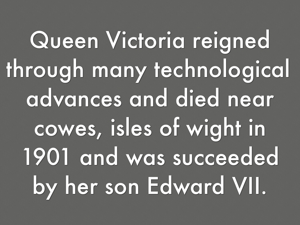 Queen Victoria reigned through many technological advances and died near cowes, isles of wight in 1901 and was succeeded by her son Edward VII.