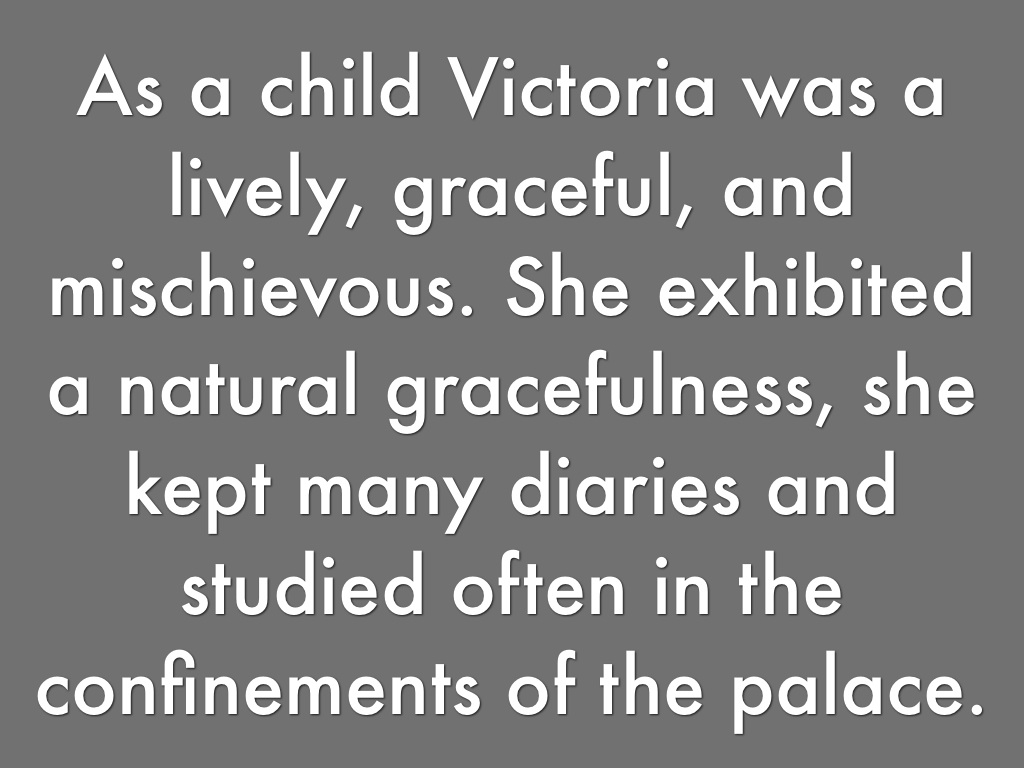 As a child Victoria was a lively, graceful, and mischievous. She exhibited a natural gracefulness, she kept many diaries and studied often in the confinements of the palace.