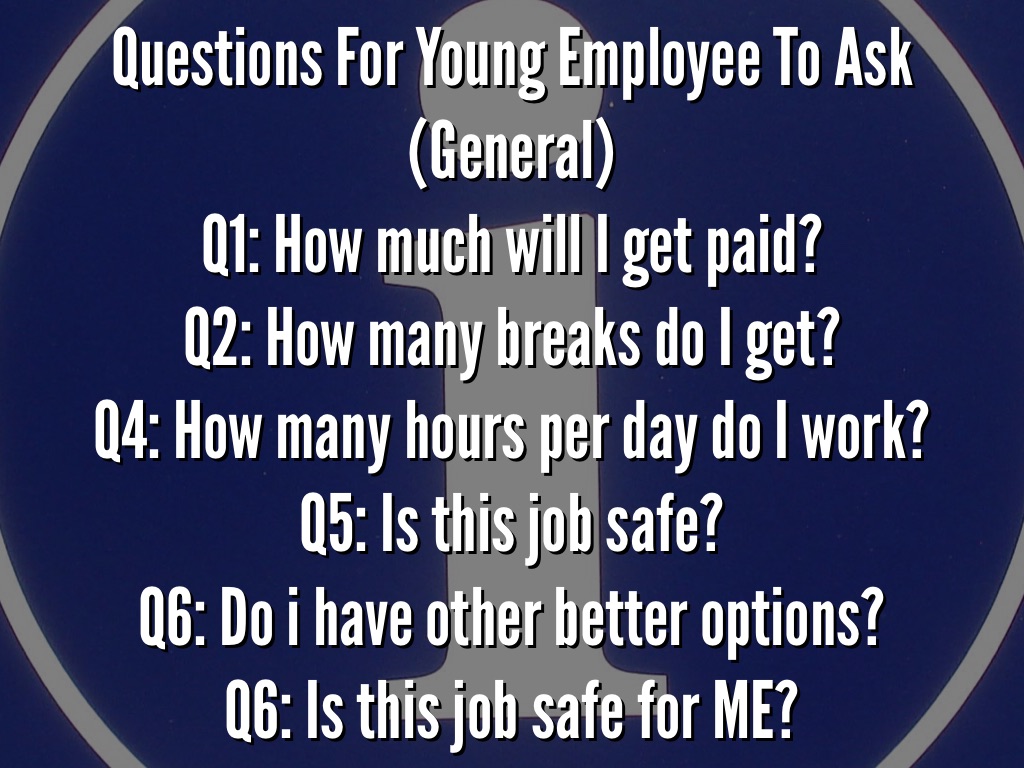Questions For Young Employee To Ask (General) Q1: How much will I get paid? Q2: How many breaks do I get? Q4: How many hours per day do I work? Q5: Is this job safe? Q6: Do i have other better options? Q6: Is this job safe for ME?