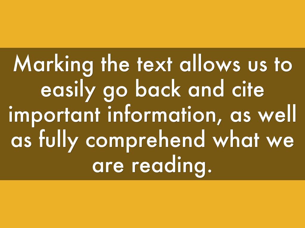 Marking the text allows us to easily go back and cite important information, as well as fully comprehend what we are reading.