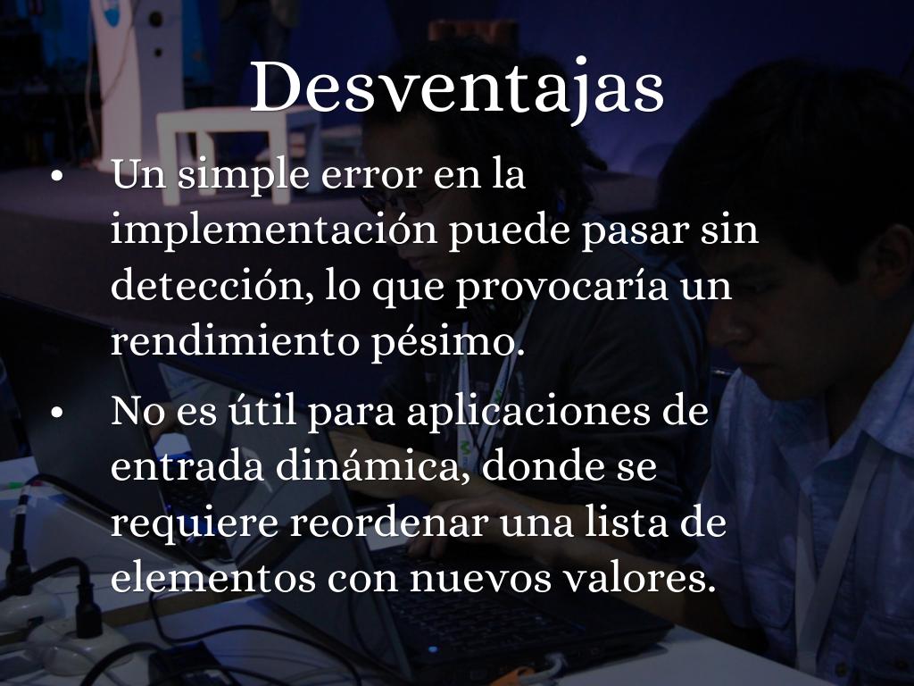 No es útil para aplicaciones de entrada dinámica, donde se requiere reordenar una lista de elementos con nuevos valores.