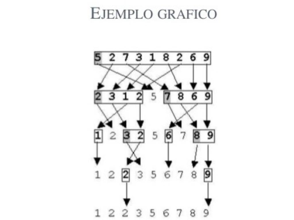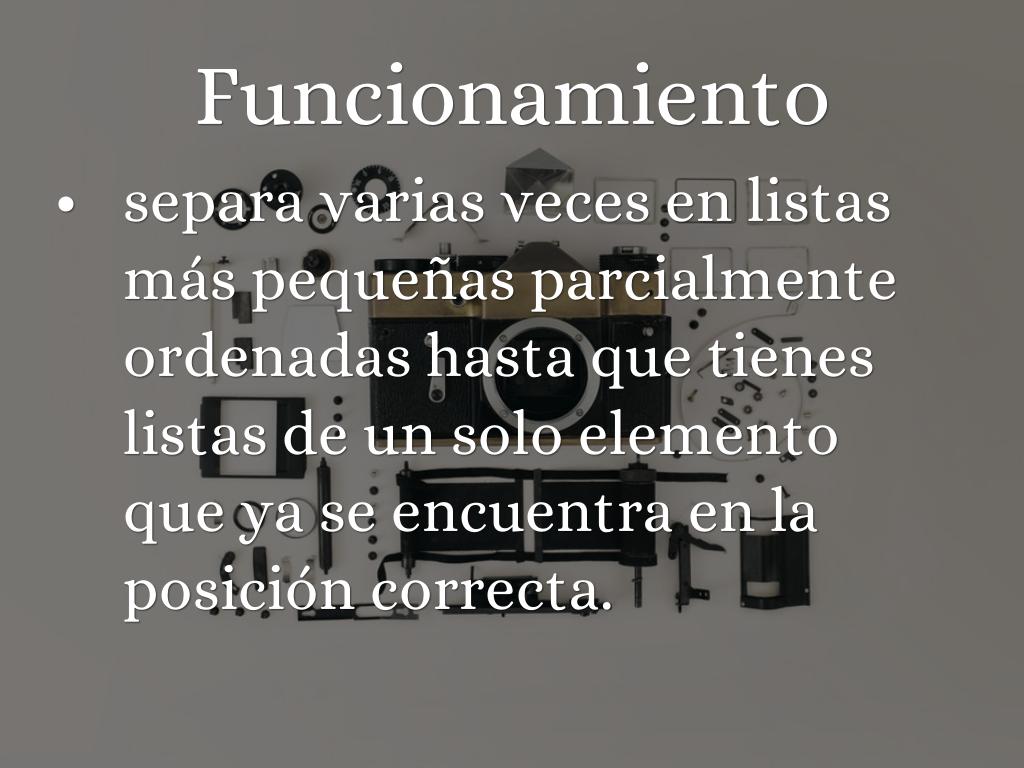 separa varias veces en listas más pequeñas parcialmente ordenadas hasta que tienes listas de un solo elemento que ya se encuentra en la posición correcta.