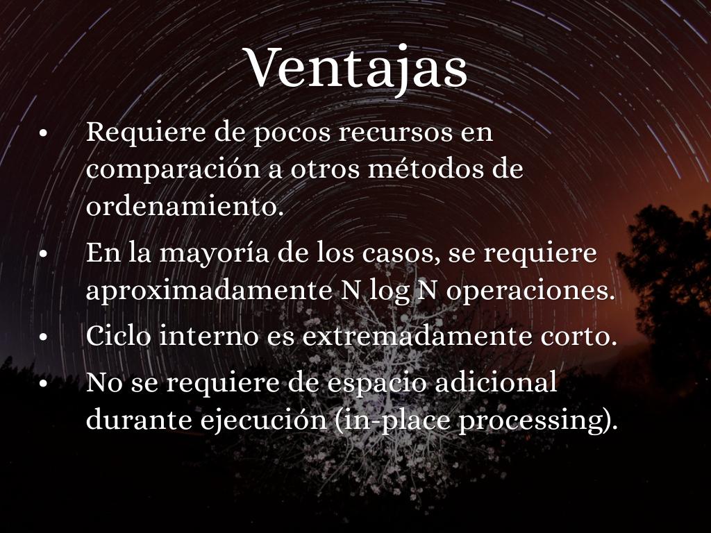 Requiere de pocos recursos en comparación a otros métodos de ordenamiento.
