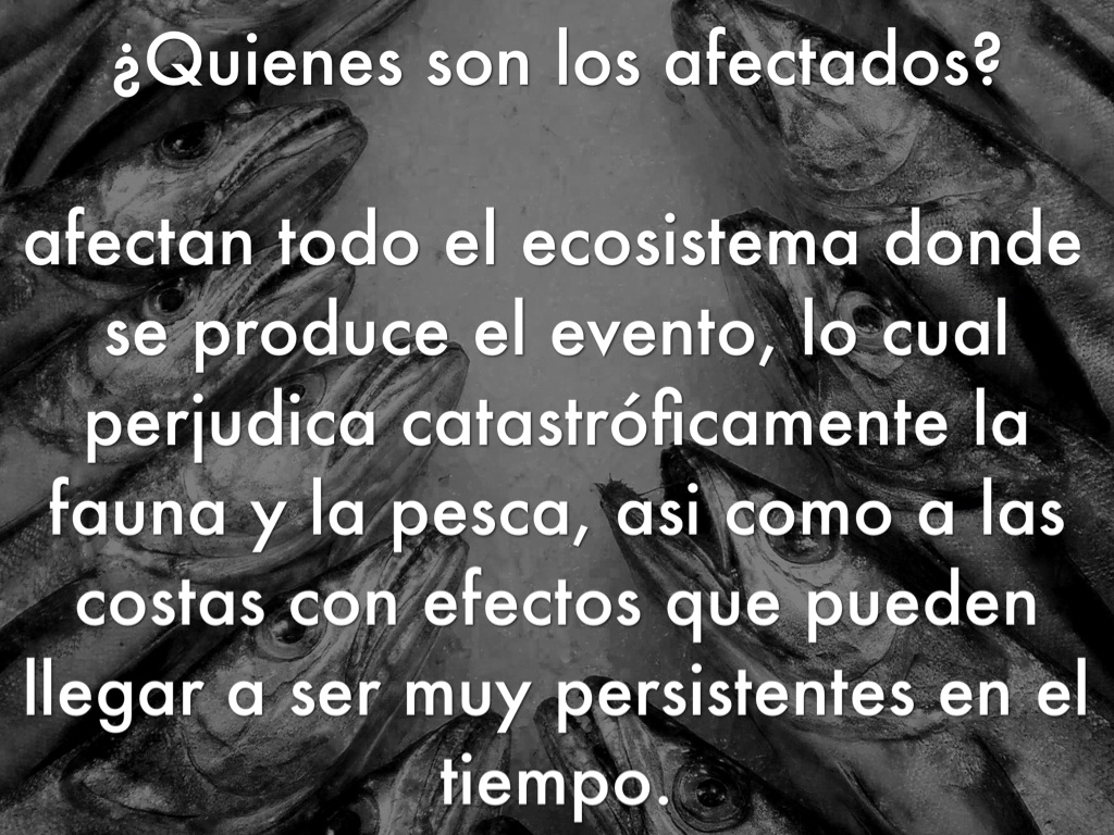 afectan todo el ecosistema donde se produce el evento, lo cual perjudica catastróficamente la fauna y la pesca, asi como a las costas con efectos que pueden llegar a ser muy persistentes en el tiempo.