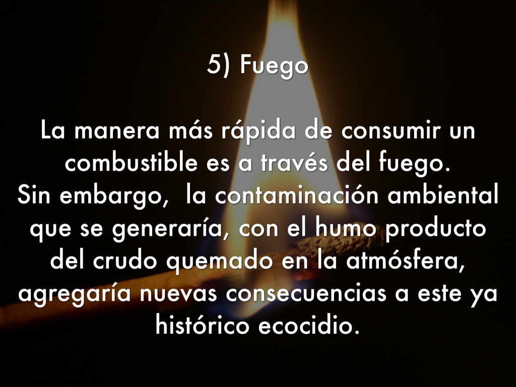 La manera más rápida de consumir un combustible es a través del fuego. Sin embargo, la contaminación ambiental que se generaría, con el humo producto del crudo quemado en la atmósfera, agregaría nuevas consecuencias a este ya histórico ecocidio.