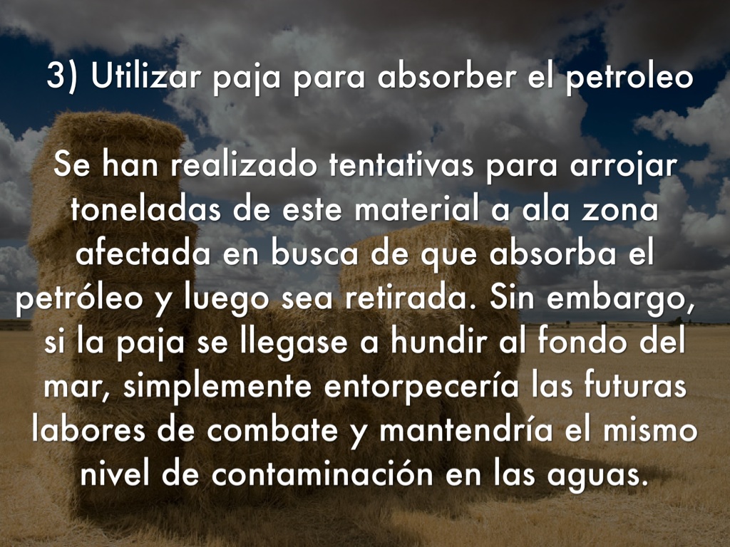 Se han realizado tentativas para arrojar toneladas de este material a ala zona afectada en busca de que absorba el petróleo y luego sea retirada. Sin embargo, si la paja se llegase a hundir al fondo del mar, simplemente entorpecería las futuras labores de combate y mantendría el mismo nivel de contaminación en las aguas.