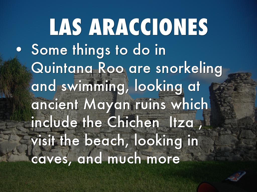 Some things to do in Quintana Roo are snorkeling and swimming, looking at ancient Mayan ruins which include the Chichen Itza , visit the beach, looking in caves, and much more