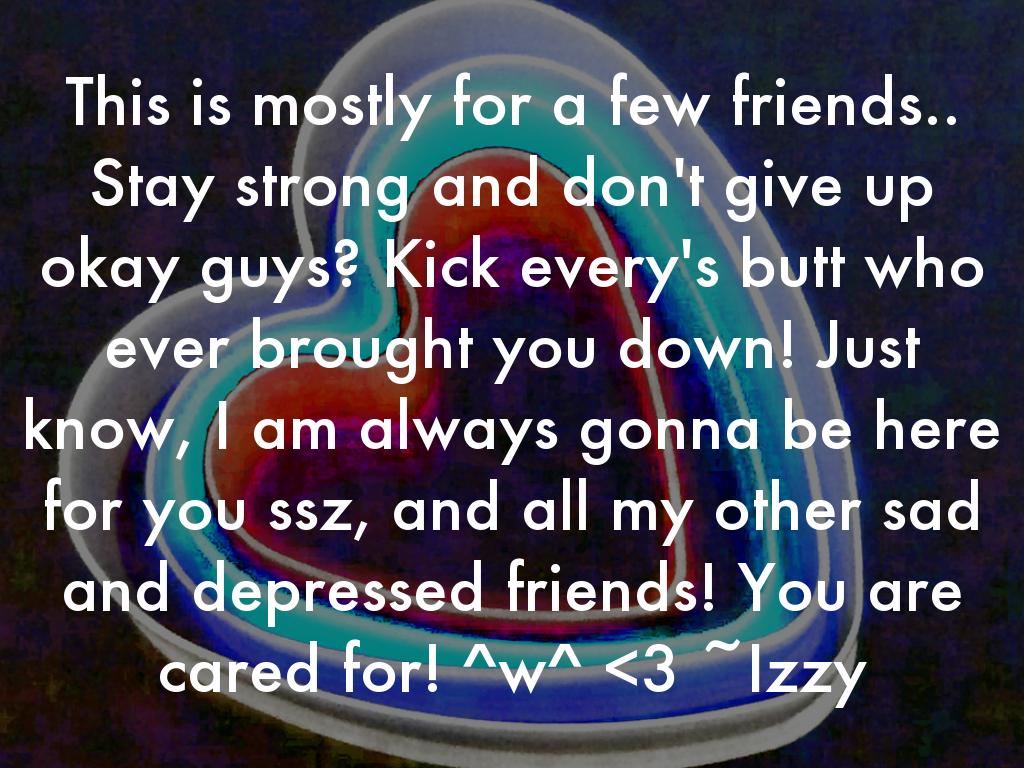 This is mostly for a few friends.. Stay strong and don't give up okay guys? Kick every's butt who ever brought you down! Just know, I am always gonna be here for you ssz, and all my other sad and depressed friends! You are cared for! ^w^
