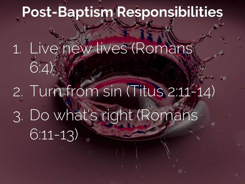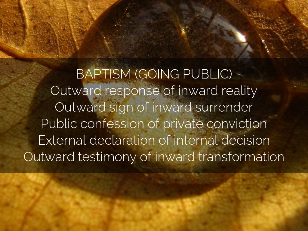 BAPTISM (GOING PUBLIC) Outward response of inward reality Outward sign of inward surrender Public confession of private conviction External declaration of internal decision Outward testimony of inward transformation