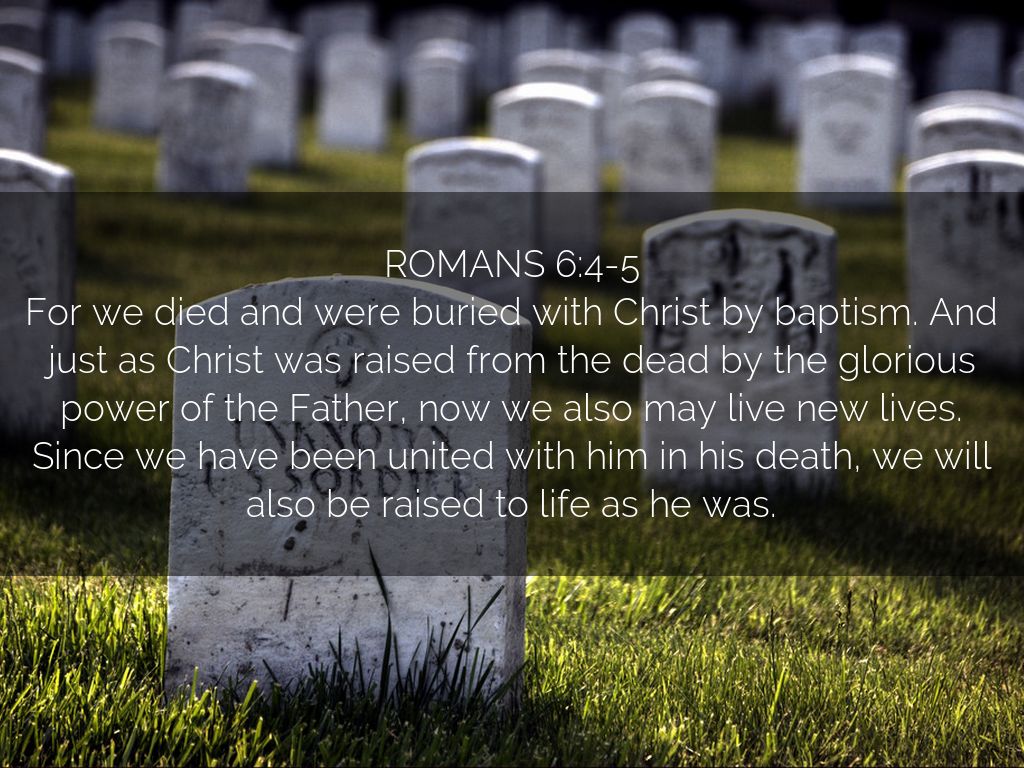 ROMANS 6:4-5 For we died and were buried with Christ by baptism. And just as Christ was raised from the dead by the glorious power of the Father, now we also may live new lives. Since we have been united with him in his death, we will also be raised to life as he was.