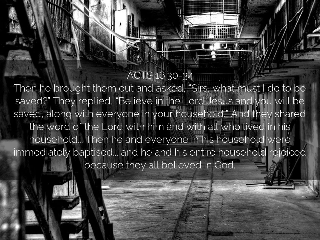 ACTS 16:30-34 Then he brought them out and asked, “Sirs, what must I do to be saved?” They replied, “Believe in the Lord Jesus and you will be saved, along with everyone in your household.” And they shared the word of the Lord with him and with all who lived in his household... Then he and everyone in his household were immediately baptised... and he and his entire household rejoiced because they all believed in God.
