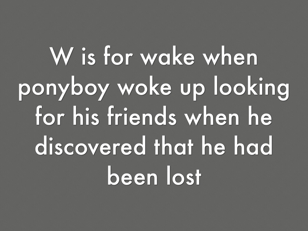 W is for wake when ponyboy woke up looking for his friends when he discovered that he had been lost