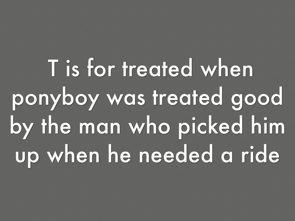 T is for treated when ponyboy was treated good by the man who picked him up when he needed a ride