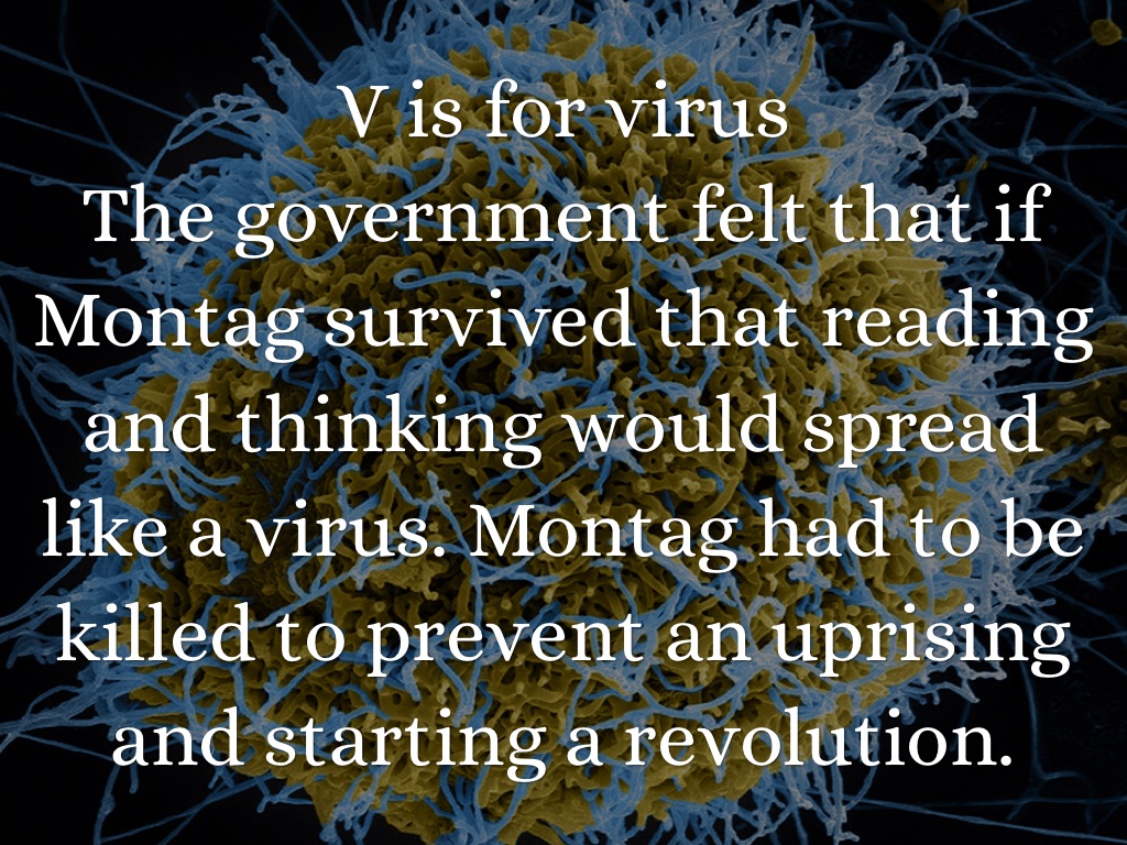 V is for virus The government felt that if Montag survived that reading and thinking would spread like a virus. Montag had to be killed to prevent an uprising and starting a revolution.