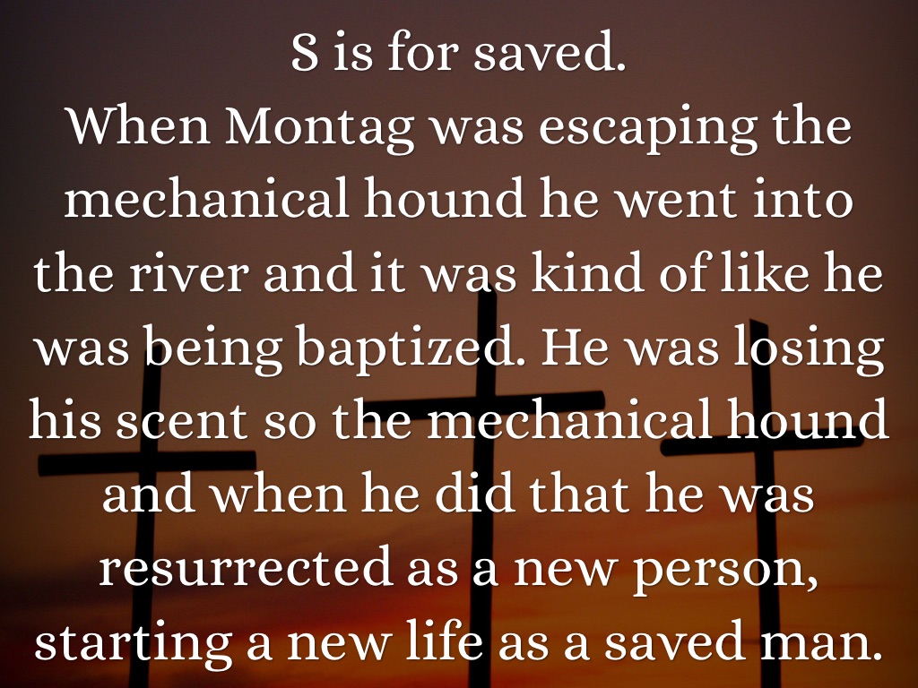 S is for saved. When Montag was escaping the mechanical hound he went into the river and it was kind of like he was being baptized. He was losing his scent so the mechanical hound and when he did that he was resurrected as a new person, starting a new life as a saved man.