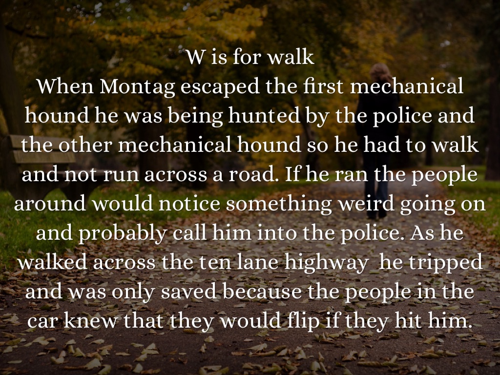 W is for walk When Montag escaped the first mechanical hound he was being hunted by the police and the other mechanical hound so he had to walk and not run across a road. If he ran the people around would notice something weird going on and probably call him into the police. As he walked across the ten lane highway he tripped and was only saved because the people in the car knew that they would flip if they hit him.