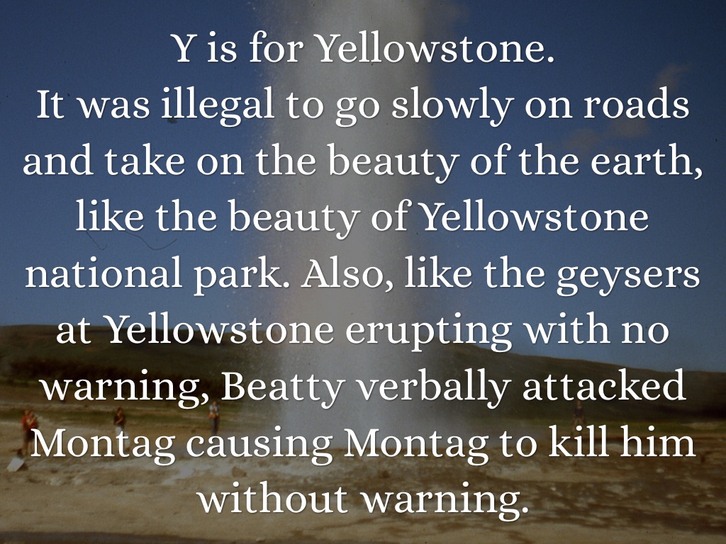 Y is for Yellowstone. It was illegal to go slowly on roads and take on the beauty of the earth, like the beauty of Yellowstone national park. Also, like the geysers at Yellowstone erupting with no warning, Beatty verbally attacked Montag causing Montag to kill him without warning.