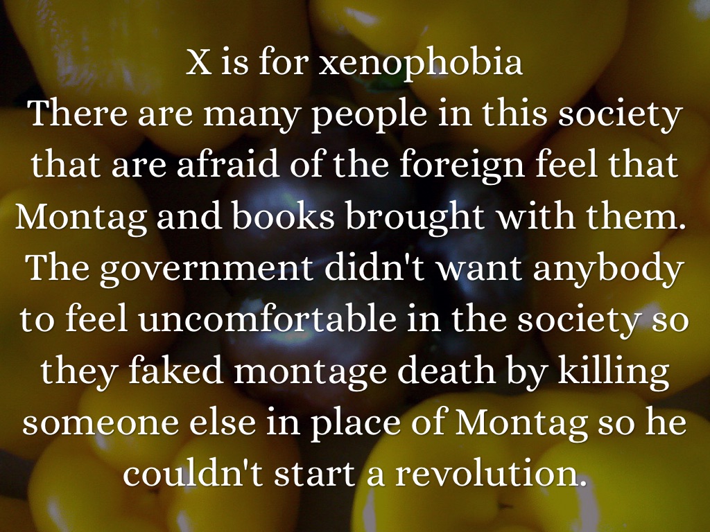 X is for xenophobia There are many people in this society that are afraid of the foreign feel that Montag and books brought with them. The government didn't want anybody to feel uncomfortable in the society so they faked montage death by killing someone else in place of Montag so he couldn't start a revolution.