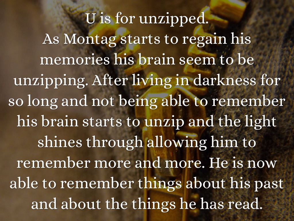 U is for unzipped. As Montag starts to regain his memories his brain seem to be unzipping. After living in darkness for so long and not being able to remember his brain starts to unzip and the light shines through allowing him to remember more and more. He is now able to remember things about his past and about the things he has read.