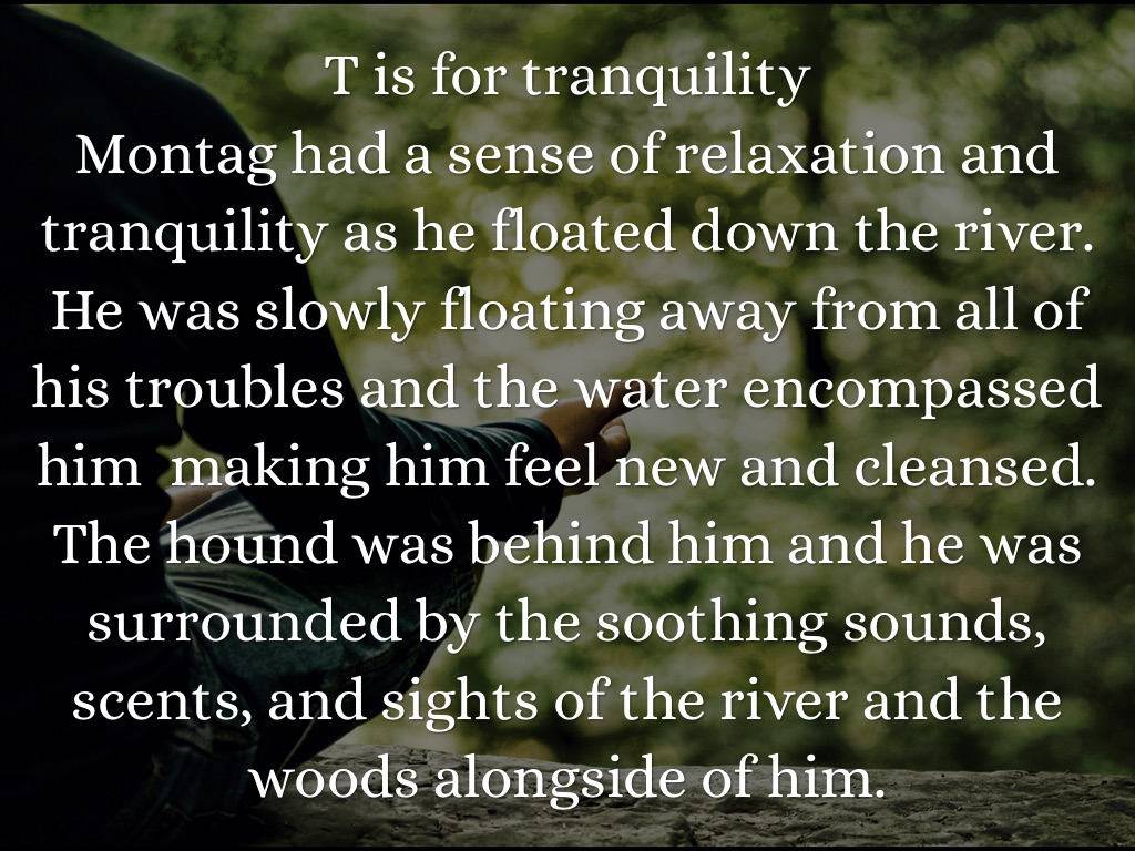 T is for tranquility Montag had a sense of relaxation and tranquility as he floated down the river. He was slowly floating away from all of his troubles and the water encompassed him making him feel new and cleansed. The hound was behind him and he was surrounded by the soothing sounds, scents, and sights of the river and the woods alongside of him.