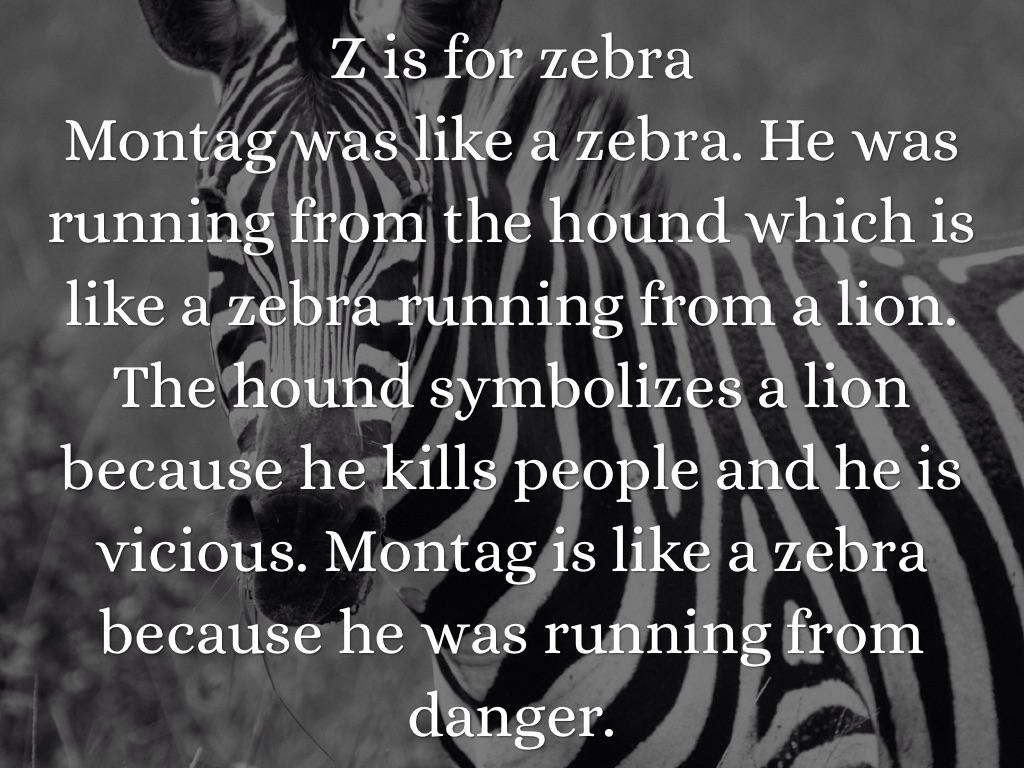 Z is for zebra Montag was like a zebra. He was running from the hound which is like a zebra running from a lion. The hound symbolizes a lion because he kills people and he is vicious. Montag is like a zebra because he was running from danger.