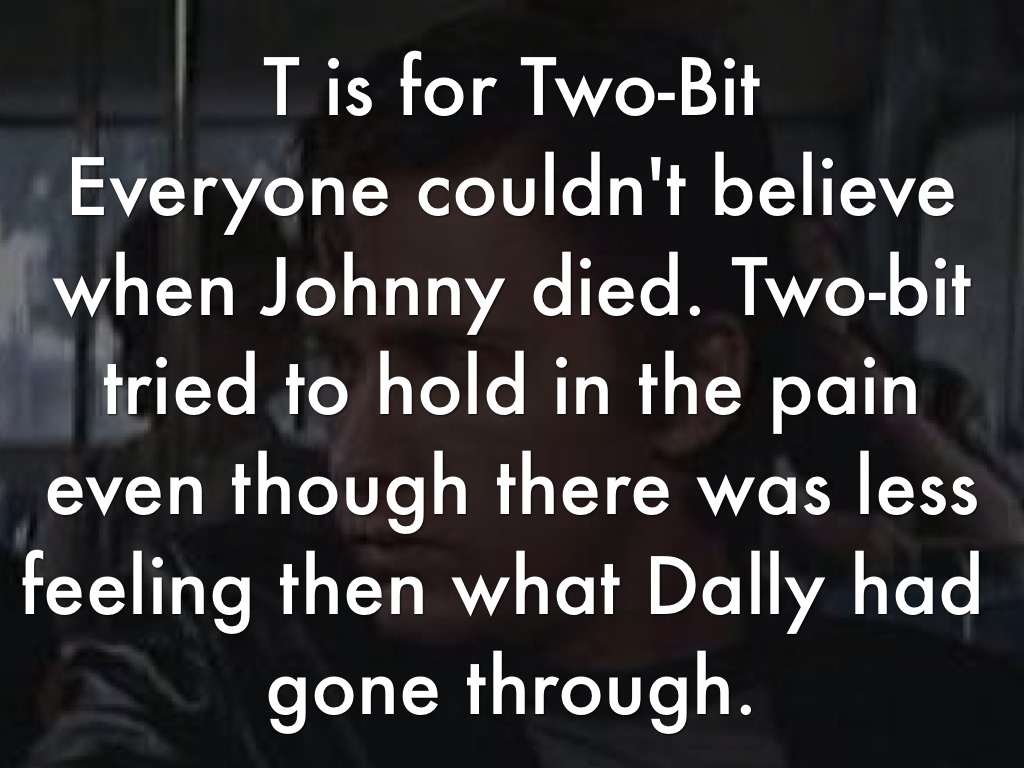 Everyone couldn't believe when Johnny died. Two-bit tried to hold in the pain even though there was less feeling then what Dally had gone through.