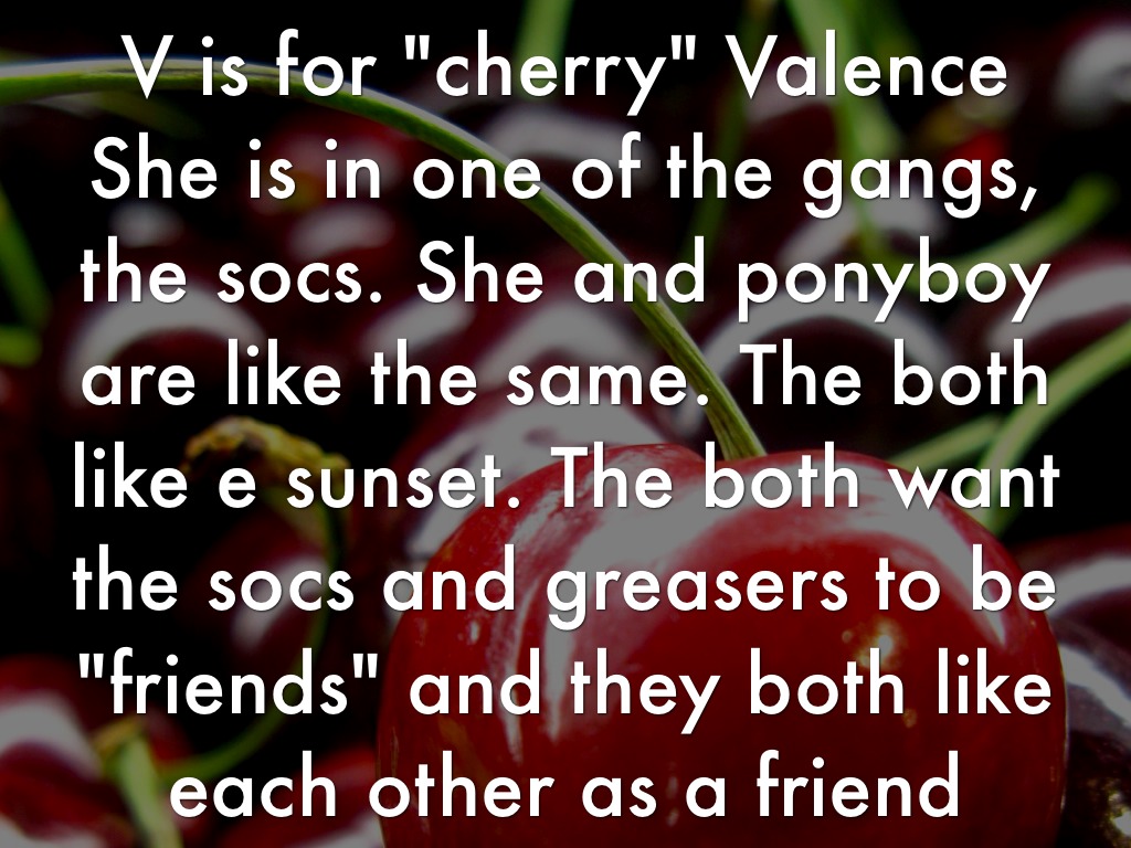 V is for "cherry" Valence She is in one of the gangs, the socs. She and ponyboy are like the same. The both like e sunset. The both want the socs and greasers to be "friends" and they both like each other as a friend