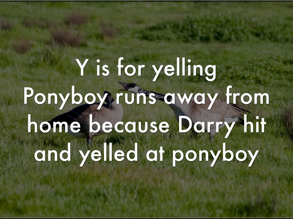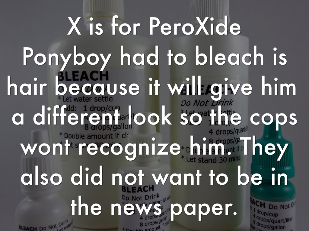 X is for PeroXide Ponyboy had to bleach is hair because it will give him a different look so the cops wont recognize him. They also did not want to be in the news paper.