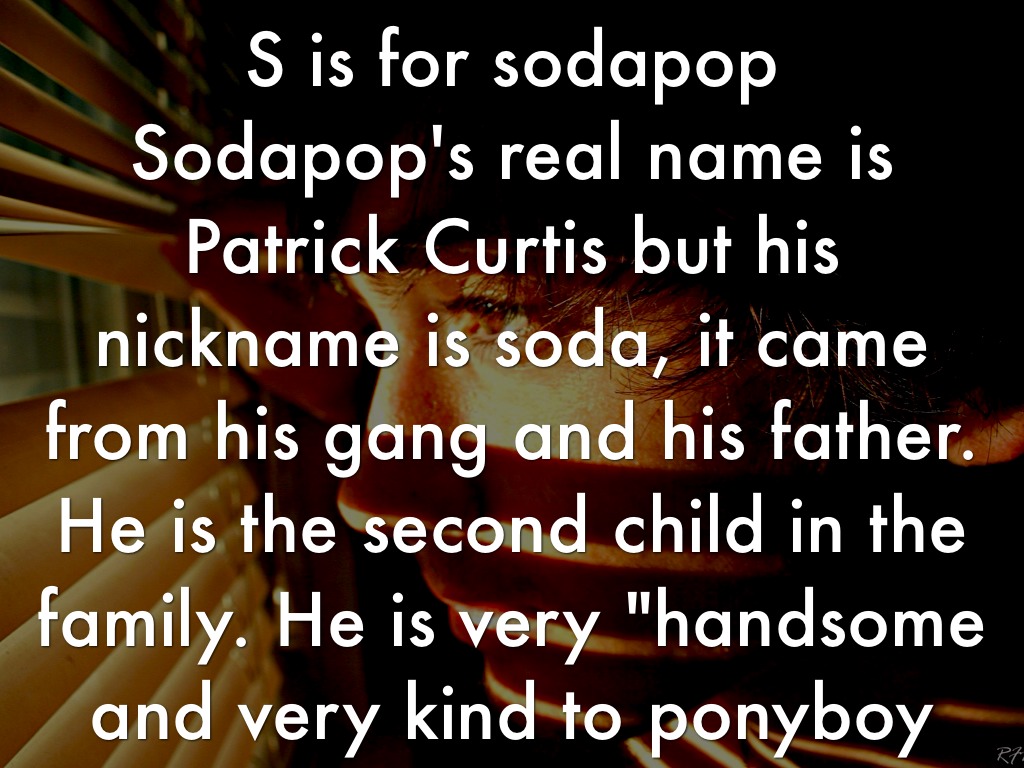 S is for sodapop Sodapop's real name is Patrick Curtis but his nickname is soda, it came from his gang and his father. He is the second child in the family. He is very "handsome and very kind to ponyboy