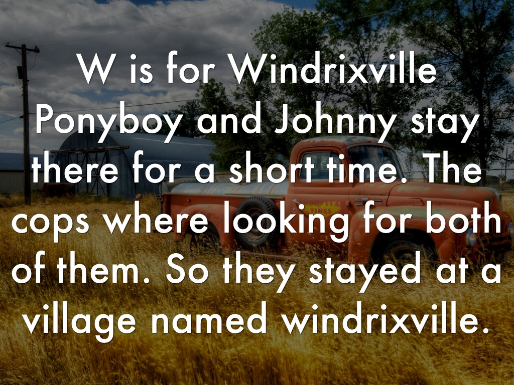 W is for Windrixville Ponyboy and Johnny stay there for a short time. The cops where looking for both of them. So they stayed at a village named windrixville.