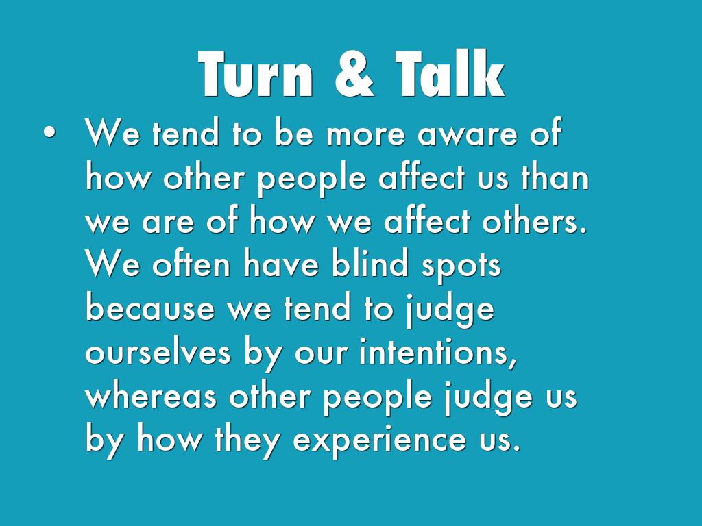 We tend to be more aware of how other people affect us than we are of how we affect others. We often have blind spots because we tend to judge ourselves by our intentions, whereas other people judge us by how they experience us.