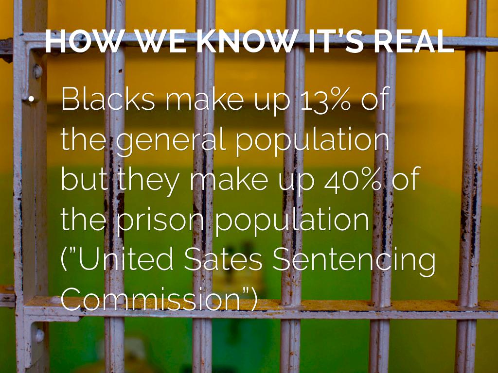 Blacks make up 13% of the general population but they make up 40% of the prison population (”United Sates Sentencing Commission”)