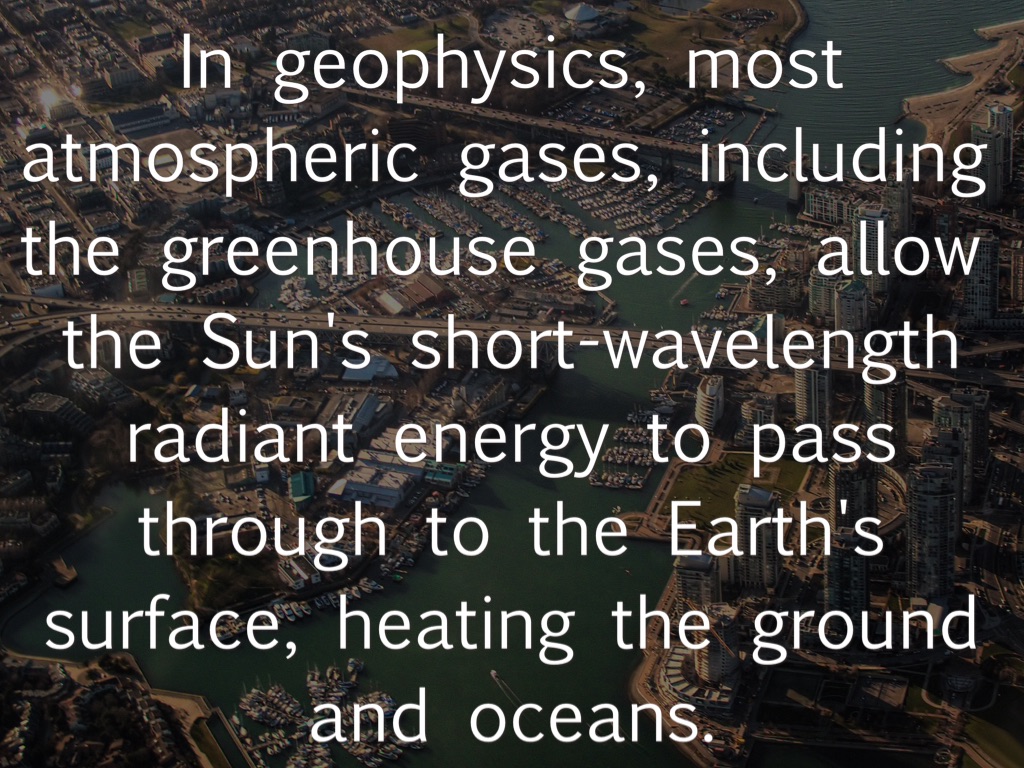 In geophysics, most atmospheric gases, including the greenhouse gases, allow the Sun's short-wavelength radiant energy to pass through to the Earth's surface, heating the ground and oceans.