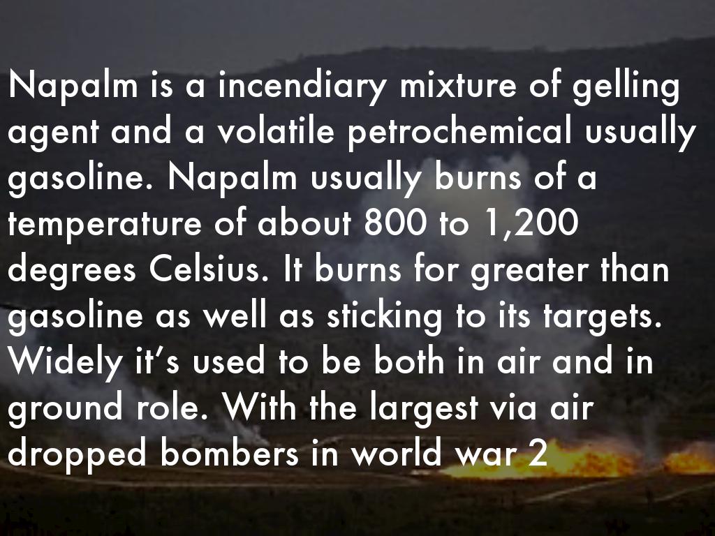 Napalm is a incendiary mixture of gelling agent and a volatile petrochemical usually gasoline. Napalm usually burns of a temperature of about 800 to 1,200 degrees Celsius. It burns for greater than gasoline as well as sticking to its targets. Widely it’s used to be both in air and in ground role. With the largest via air dropped bombers in world war 2