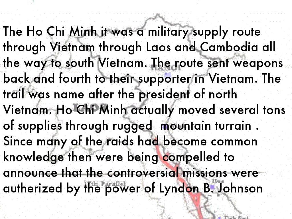 The Ho Chi Minh it was a military supply route through Vietnam through Laos and Cambodia all the way to south Vietnam. The route sent weapons back and fourth to their supporter in Vietnam. The trail was name after the president of north Vietnam. Ho Chi Minh actually moved several tons of supplies through rugged mountain turrain . Since many of the raids had become common knowledge then were being compelled to announce that the controversial missions were autherized by the power of Lyndon B. Johnson