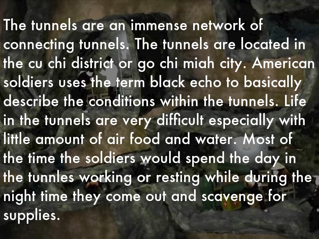 The tunnels are an immense network of connecting tunnels. The tunnels are located in the cu chi district or go chi miah city. American soldiers uses the term black echo to basically describe the conditions within the tunnels. Life in the tunnels are very difficult especially with little amount of air food and water. Most of the time the soldiers would spend the day in the tunnles working or resting while during the night time they come out and scavenge for supplies.