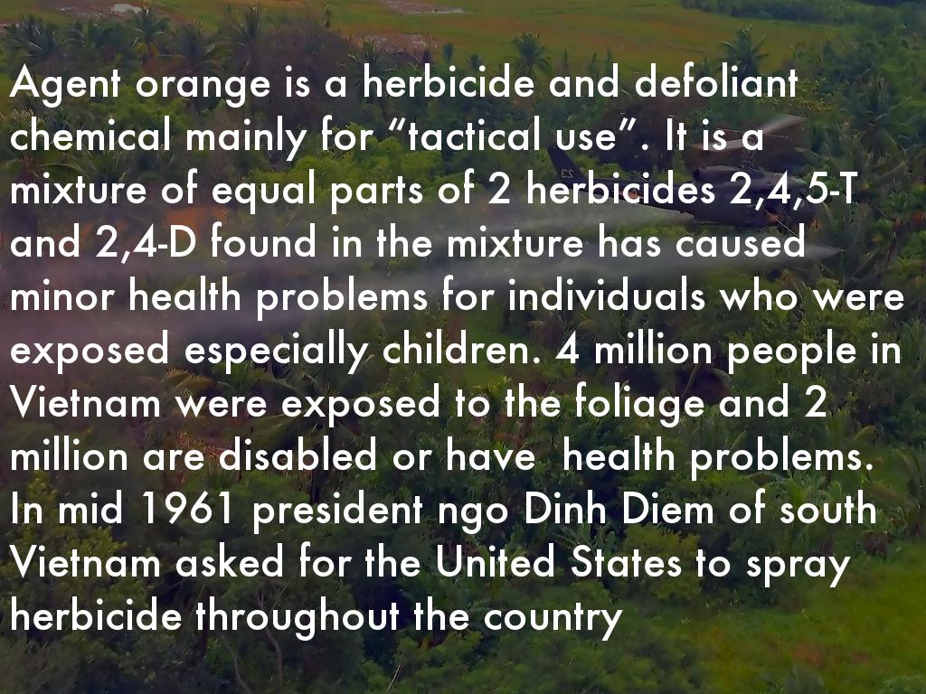 Agent orange is a herbicide and defoliant chemical mainly for “tactical use”. It is a mixture of equal parts of 2 herbicides 2,4,5-T and 2,4-D found in the mixture has caused minor health problems for individuals who were exposed especially children. 4 million people in Vietnam were exposed to the foliage and 2 million are disabled or have health problems. In mid 1961 president ngo Dinh Diem of south Vietnam asked for the United States to spray herbicide throughout the country