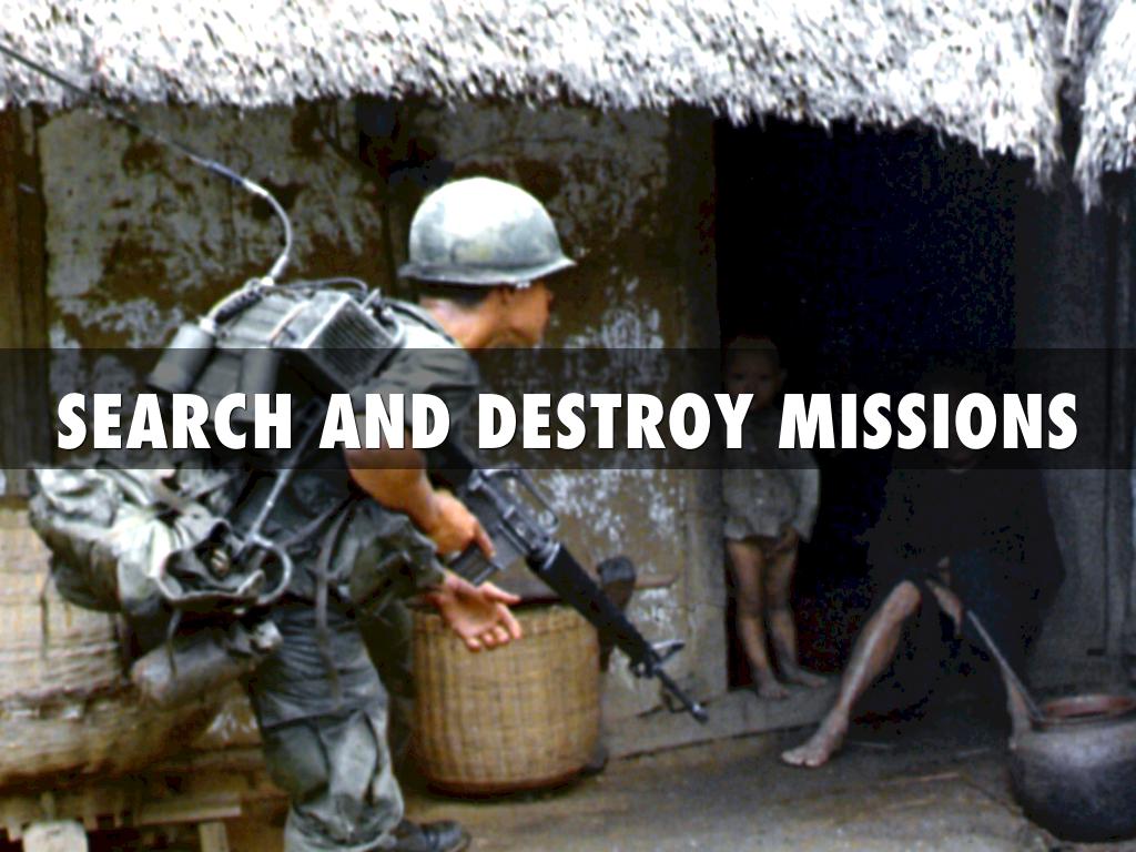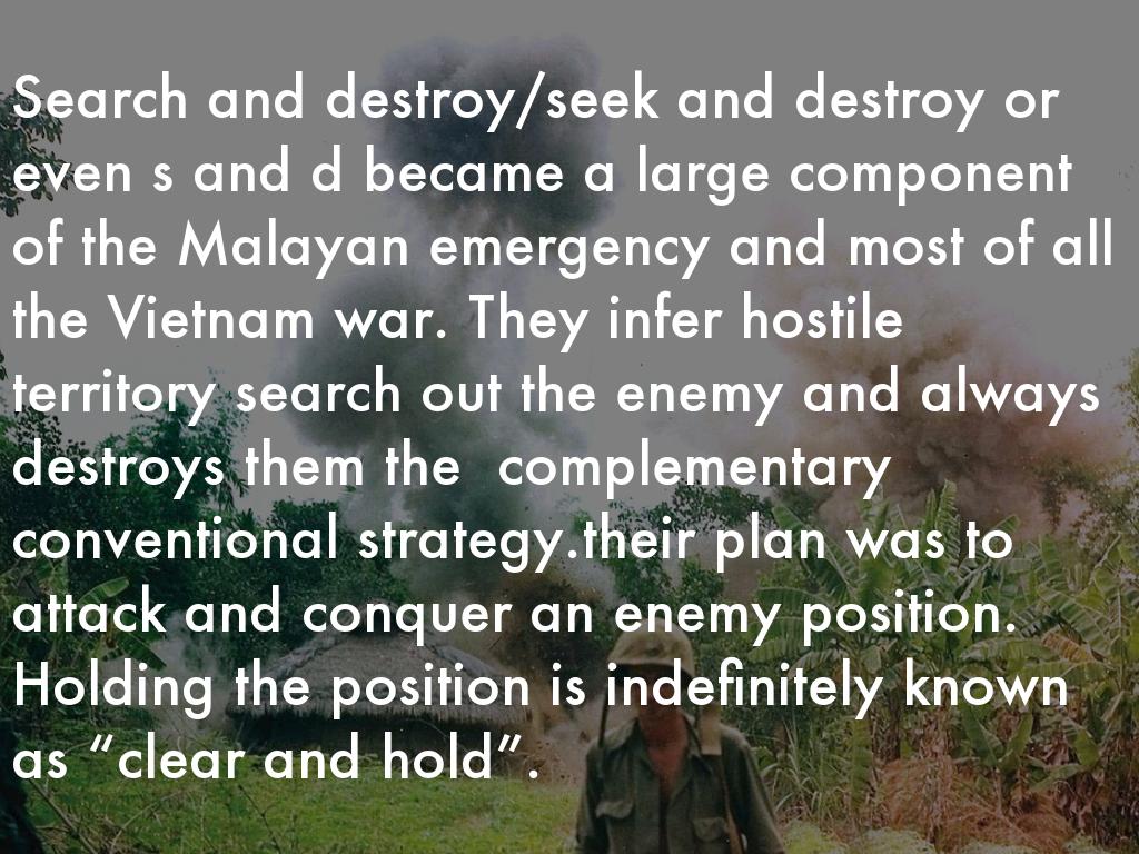 Search and destroy/seek and destroy or even s and d became a large component of the Malayan emergency and most of all the Vietnam war. They infer hostile territory search out the enemy and always destroys them the complementary conventional strategy.their plan was to attack and conquer an enemy position. Holding the position is indefinitely known as “clear and hold”.