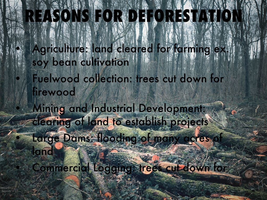 - Deforestation: the clearing of trees, transforming a forest into cleared land