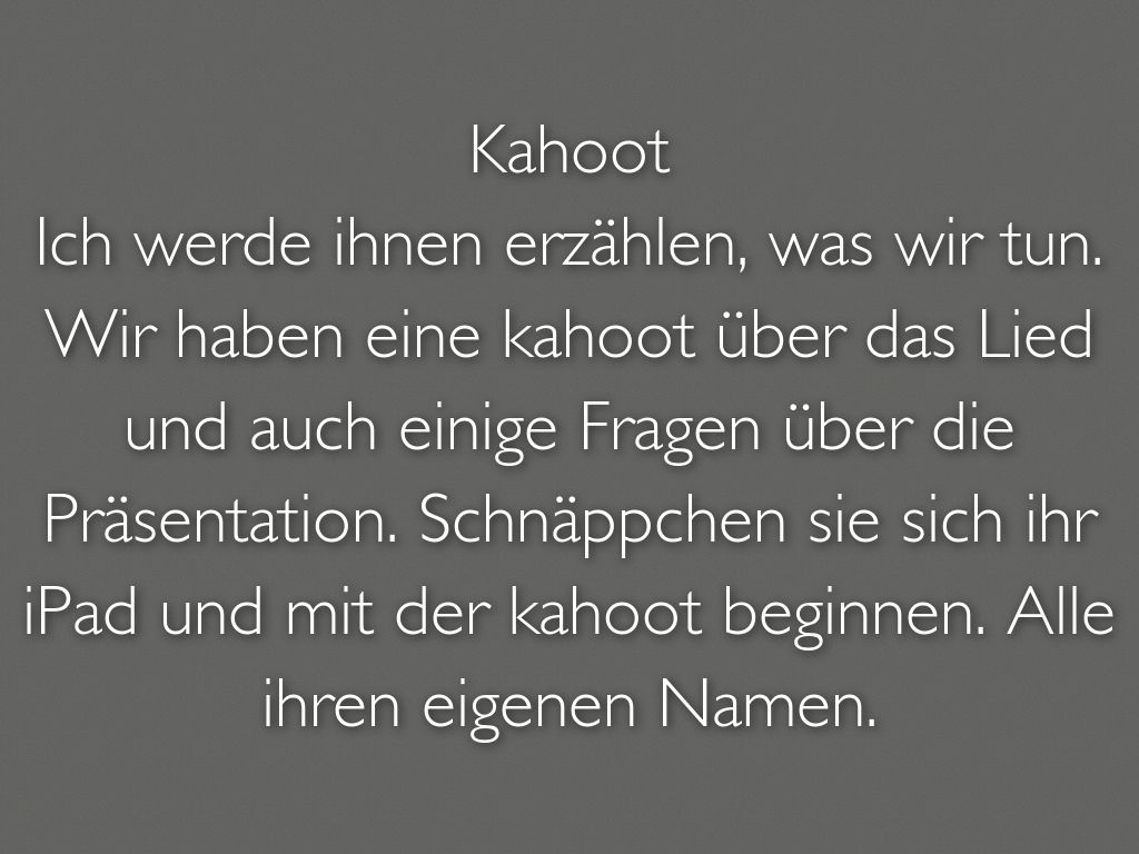 Ich werde ihnen erzählen, was wir tun. Wir haben eine kahoot über das Lied und auch einige Fragen über die Präsentation. Schnäppchen sie sich ihr iPad und mit der kahoot beginnen. Alle ihren eigenen Namen.