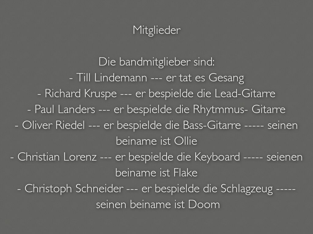 Rammstein ist gegrundet durch Gittarist Richard Sven Kruspe. In 1989 ist er gefluchtet von OstDeutschland nach West Deutschland wo er in 1991 die Rockband Orgasm Death Gimmicks gründete. Als die Berliner Mauer fiel, ging er zuSchwerin, wo ein guter Freund von ihm, TillLindemann arbeitete als Korbflechter. Richard lebte zu der Zeit im Haus bei Oliver Riedel (derin der Zeit spielte in der Band The Inchtabokatables). Richard konnte sich nicht identifizieren mit der Musik, und wollte etwasmit Maschinen und schweren Gitarren. Die dreibegannen zusammen das neue Projekt.