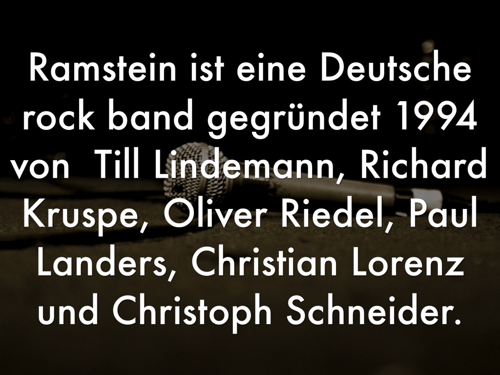 Ramstein ist eine Deutsche rock band gegründet 1994 von Till Lindemann, Richard Kruspe, Oliver Riedel, Paul Landers, Christian Lorenz und Christoph Schneider.