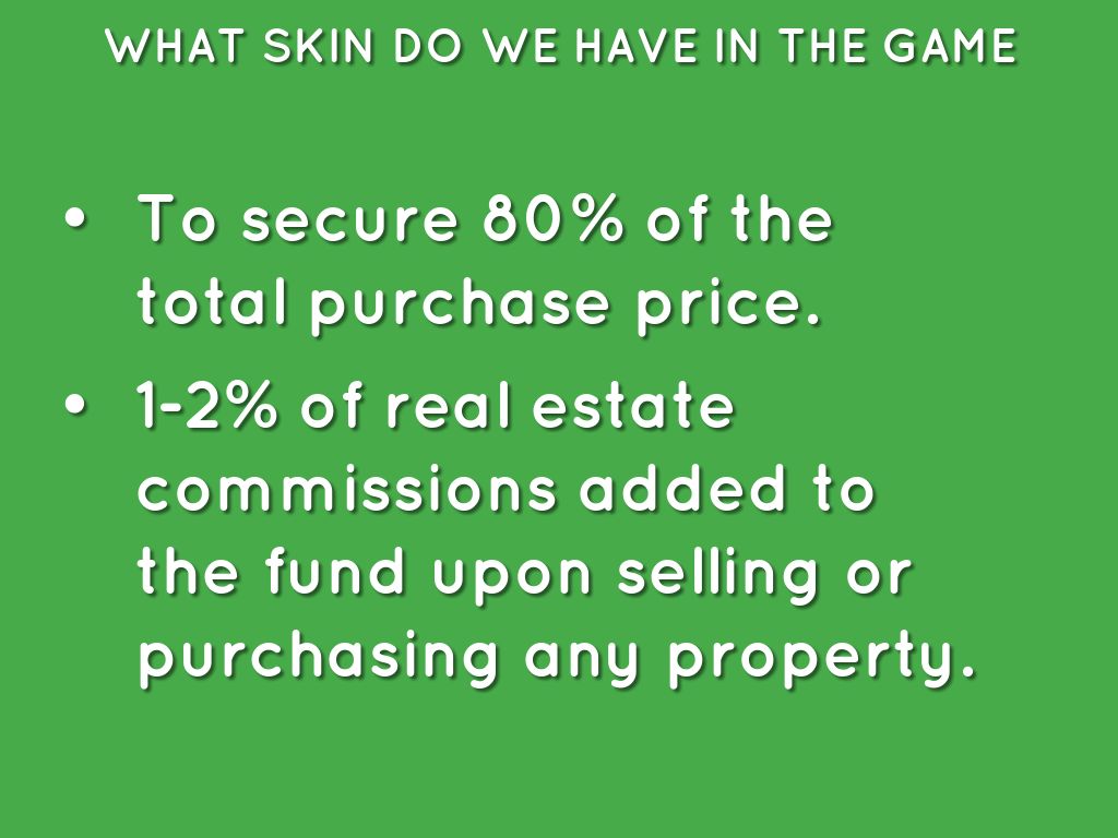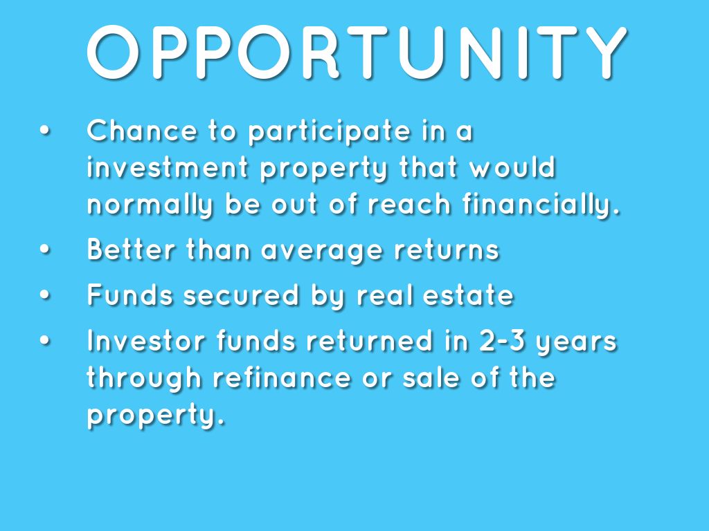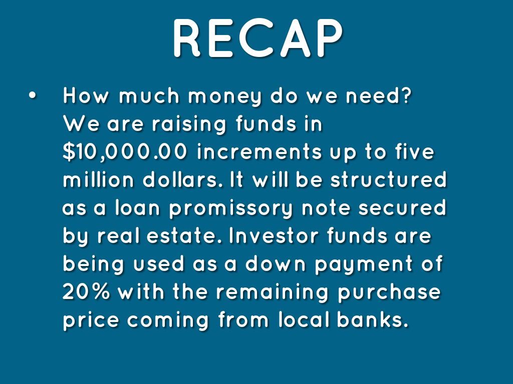 How much money do we need? We are raising funds in $10,000.00 increments up to five million dollars. It will be structured as a loan promissory note secured by real estate. Investor funds are being used as a down payment of 20% with the remaining purchase price coming from local banks.