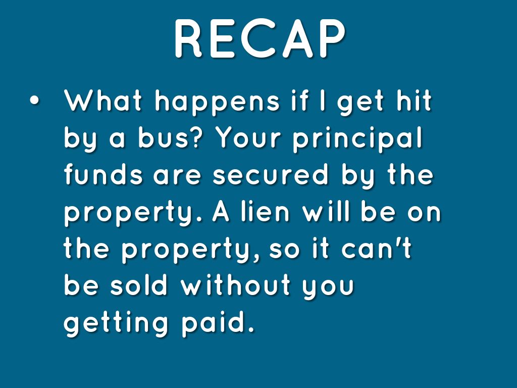 What happens if I get hit by a bus? Your principal funds are secured by the property. A lien will be on the property, so it can't be sold without you getting paid.