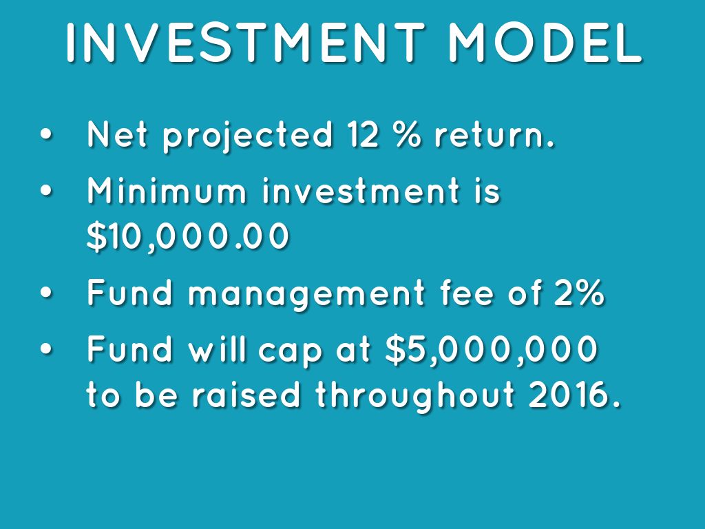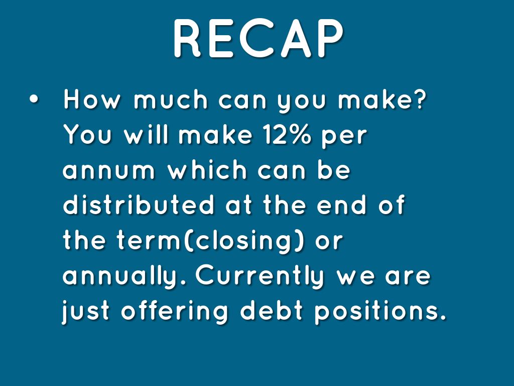 How much can you make? You will make 12% per annum which can be distributed at the end of the term(closing) or annually. Currently we are just offering debt positions.